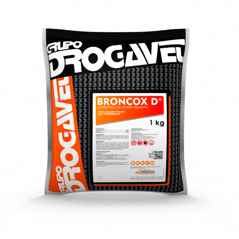 Usos: BRONCOX D Solución inyectable es una combinación de dos antibióticos bacteriostáticos sinérgicos, de acción rápida y prolongada. • Bovinos: Neumoenteritis, neumonía, Difteria, infecciones podales y Metritis. • Ovinos, caprinos y camélidos sudamericanos: Pleuroneumonía, metritis, Agalactia. • Aves (pollos, gallinas y pavos): Infecciones por Mycoplasma gallisepticum, Mycoplasma sinoviae, Mycoplasma meleagridis; E.R.C., síndromes respiratorios, colibacilosis, colisepticemia, coriza infecciosa, cólera aviar, clostridiosis. Porcinos: Neumonía enzoótica, Pasteurella multocida y Corynebacterium pyogenes; erisipelas causadas por Erysipelothrix rhusiopathiae; rinitis atrófica y disentería porcina. Artritis causada por Mycoplasma hyosynoviae y Staphylococcus spp.